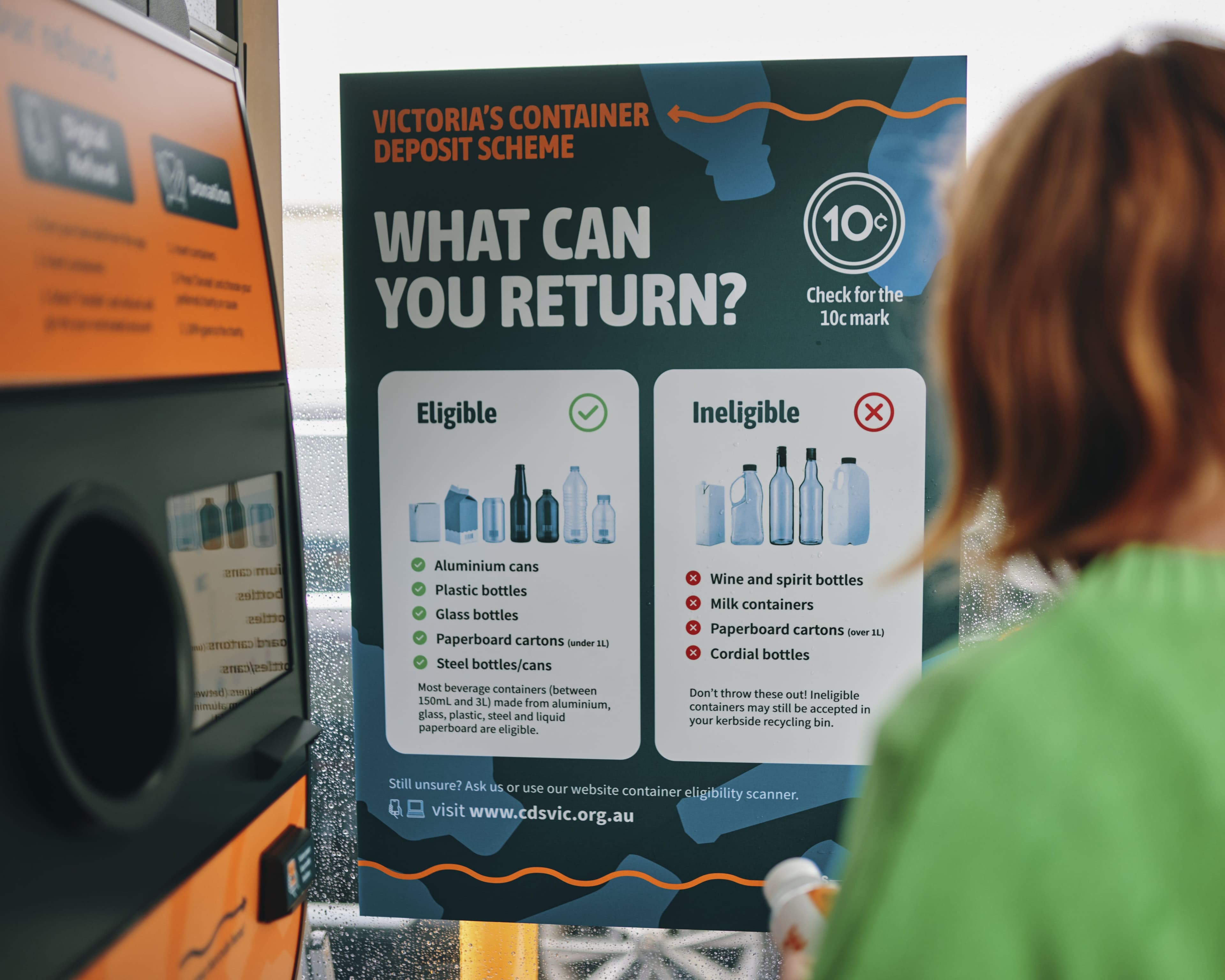 CDS Vic provides a 10 cent refund for every eligible drink container returned. Each bottle, can and carton that you return helps to divert valuable containers from landfill.