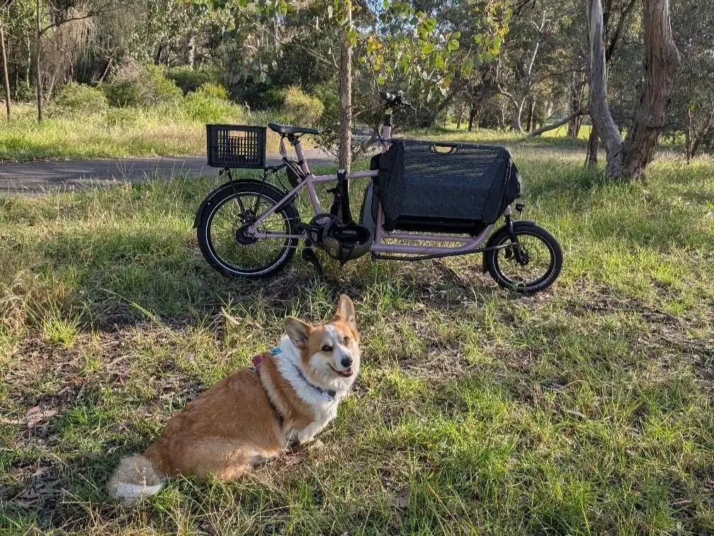 A corgi getting a ride in the front of an electric bike is pretty adorable. Add some containers, and that’s even better.